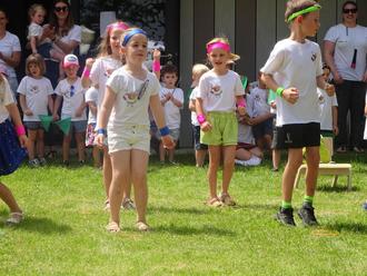 Um 14 Uhr am 29.06.2024 trafen sich alle Kinder der Kita Am Wingertsberg in ihren Gruppenräumen und warteten gespannt darauf die Wir-Festspiele zu eröffnen. Mit Fähnchen entsprechend der Gruppenfarben und Trikots ausgestattet liefen wir mit dem bekannten Sommerhit „Waka Waka“ auf unsere Sommerbühne ein. Wir begrüßten mit unseren Wirs gemeinsam unsere Familien mit dem Lied „Wir feiern heute Sommerfest“. Nora und Mara begrüßten mit einem Mikrofon und luden alle Familien ein sich gemeinsam mit uns für die Wir-Festspiele aufzuwärmen. Die zukünftigen Schulkinder tanzen für uns den „Sportinator“ und brachten uns in Stimmung für die bevorstehenden Aufgaben. Gemeinsam mit den Eltern durften die Kinder vier bewegungsaktive Stationen bewältigen. Doch bevor es losging eröffneten wir feierlich unseren Stationsmarathon mit dem Entzünden des Wir-Festspiel-Feuers. Dann ging es aber los. Mit den Stationskarten durchliefen nun nach und nach alle Kinder, auch gerne mehrmals, die verschiedenen Stationen: Weitsprung, Weitwurf, Dreibeinlauf oder Steckpferdchenrennen und einen Parcours.