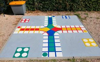 Das Mensch-ärgere-dich-nicht-Spielfeld auf dem Spielplatz Auf der Höchst wurde erneuert, weil sich mittlerweile die alte Farbe löste und abblätterte. Es liegen auch neue Spielfiguren und ein neuer Würfel in der Kiste (im Bild links hinter dem Spielfeld). Es kann also wieder gespielt werden! Viel Spaß dabei!