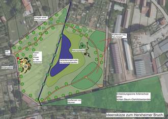 Um die ökologische Entwicklung dieser Freifläche voranzutreiben, hat Ortsbürgermeister Sven Koch in Zusammenarbeit mit dem Landschaftsarchitekten Kurt Garrecht eine Konzeption erarbeitet, die unter anderem die Aufwertung des Bruchgrabens sowie die Herstellung einer Retentionsmulde vorsieht. Sie lehnt sich somit an Maßnahmen aus dem Starkregenvorsorgekonzept der Verbandsgemeinde Herxheim an. Darüber hinaus sind Gehölzsäume – sogenannte Tiny-Forests – und eine Streuobstwiese eingeplant. Um den Naherholungsbereich erlebbar zu machen, ist eine Fläche als Bürgergarten sowie ein naturnahes Kindererlebnisfeld vorgesehen.