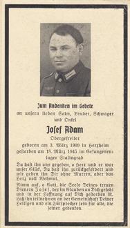 Da Josef Adam nicht verheiratet war und niemand sein Gedenken in die nächste Generation trug, sind die Nachrichten von ihm spärlich, so wie bei zahlreichen anderen Gefallenen.