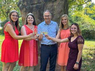 Hanna Spies und Laura Götze (Weinprinzessinnen 2022/2023) Landrat Dietmar Seefeldt, Sarah Eid und Joanne Stibig (Weinprinzessinnen 2023/2024)