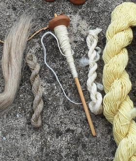 Wir verwenden moderne Spindeln aus Holz, die sich etwas einfacher handhaben lassen und aus gleichem Grund gewaschene und gekämmte Schafwolle.
