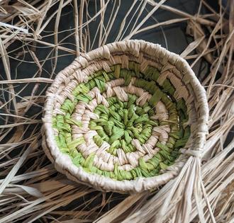 Aufgrund der Bodenbeschaffenheit haben sich in Herxheim keine organischen Materialien wie Holz oder Pflanzenfasern erhalten. Durch Vergleichsfunde dürfen wir aber annehmen, dass Fasern wie Lindenbast schon vor 7000 Jahren eine breite Anwendung fanden. Der etwas spätere Fund der Eismumie „Ötzi“ und auch Feuchtbodenfunde zeigen, dass viele verschiedene Knüpf- und Flechttechniken bekannt waren. Wir zeigen heute, wie man in leicht zu lernender Wickeltechnik ein kleines Körbchen aus Bast herstellen kann – ideal für die kleinen Schätze des Alltags, Schmuck, steinzeitliche Pfeilspitzen oder als Geschenk. Aufgrund der Beschaffbarkeit verwenden wir Raffiabast.