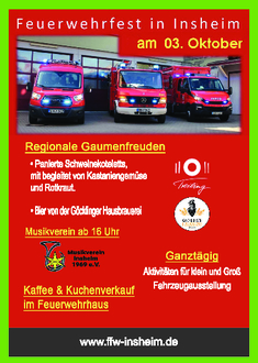 Die Freiwillige Feuerwehr Insheim lädt die Bewohner von Insheim und Umgebung herzlich zu ihrem alljährlichen Feuerwehrfest ein, das am 3. Oktober 2023 stattfindet. Von 10:30 Uhr bis 18:00 Uhr wird dieses Fest eine entspannte Atmosphäre und Gelegenheit zum gemütlichen Beisammensein bieten.