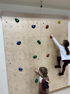 Die Griffe der Kletterwand lassen sich einfach versetzen, sodass man den Schwierigkeitsgrad variieren kann und somit allen Kindern eine entwicklungsbezogene Herausforderung und Förderung der Bewegungsmotorik stellen kann.