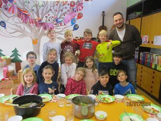 Jeder der Wackelzähne durfte dann etwas in den Topf dazugeben und helfen umrühren, bis wir dann zusammen in gemütlicher Runde die „Wackelzahn - Suppe“ mit Nudeleinlage und selbstgebackenem Brot gegessen haben.