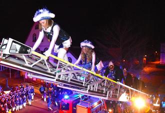 Die große Garde und das Komitee stürmten über die Drehleiter das Rathaus und empfingen auf dem Balkon das Prinzenpaar, das zuvor im ausgefahrenen Drehleiterkorb in luftiger Höhe einen exklusiven Blick über Herxheim werfen durfte.
