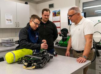 Der interkommunale Gerätewart Ari Gadinger (links), Gerätewart MarcoDosch (Mitte) und Bürgermeister Christian Sommer (rechts) prüfen Atemschutzgeräte des Landkreises SÜW.