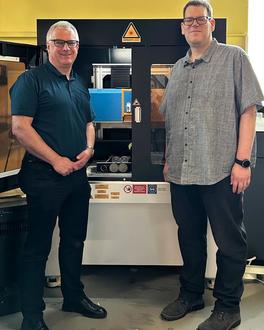 Bürgermeister Christian Sommer mit Andy Glaser, der die Lasermaschine im Hintergrund erläutert.