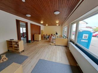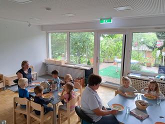 Nach den Sommerferien war es dann endlich so weit. Unsere älteren Kinder zogen in der Übergangslösung ein. Sie verbringen hier die Mittagszeit. Kurz vor 12 Uhr machen sich die Essenskinder der Gruppen Füchse und Eichhörnchen auf den Weg nach oben. In den neuen Garderoben ziehen sie sich um und gehen in Ihren Raum. Dort decken die Kinder gemeinsam den Esstisch. Ein gemeinsames Gebet eröffnet dann das Mittagessen. Nach dem Essen verbleiben die Kinder dann bis ca. 13:45 Uhr in den Räumlichkeiten im gemeinsamen Freispiel, Malen, Basteln und Ausruhen. Danach machen sie sich wieder auf den Weg nach unten in die Kita.