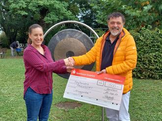 Die Referentin für Presse- und Öffentlichkeitsarbeit Cristin Cartharius-Benz und Bernd Gauly bei der symbolischen Spendenübergabe.