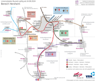 - Herxheim: Umsteigen zu den Buslinien 553 und 554 an den Haltestellen Kirche/Museum und Freibad.