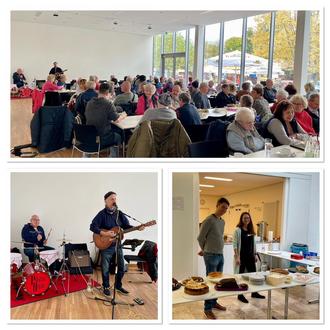 Erstmalig fand das Herbst-Café beim Gallusmarkt für Senior:innen in diesem Jahr im kleinen Saal der Elmar-Weiller-Festhalle mit Blick auf das bunte Treiben auf den Kerweplatz statt. Die Eltern der Kindertagesstätte Am Wingertsberg verwöhnten die Besucher:innen liebevoll mit selbstgebackenem Kuchen und Torten, süßen Leckereien und frisch gebrühtem Kaffee. Für Kaltgetränke war ebenso gesorgt – sie standen für alle auf den Tischen zur Verfügung. Das Musiker-Duo „Pälzer Helde“ sorgte für die musikalische Unterhaltung mit Liedern wie z. B. „Rahmkuche“ und „Danzkränzl“. Die beiden Musikusse animierten die Gäste zum Mitmachen und Mitsingen. Der Sozialdienst vom Altenzentrum St. Josef war mit rd. 40 Personen dabei.