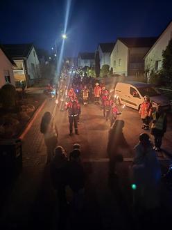 Im Anschluss zog ein großer, leuchtender Laternenumzug durch die Straßen von Insheim – begleitet von stimmungsvoller Musik des Musikvereins Insheim – bis hin zum Dorfgemeinschaftshaus. Dort fand der Abend bei einem gemütlichen Beisammensein seinen Ausklang. Bei Kinderpunsch, Glühwein, frischen Waffeln und Würstchen im Brötchen wurde gemeinsam gefeiert und die schöne Atmosphäre genossen. Natürlich durfte auch das traditionelle Martinsfeuer nicht fehlen, das Groß und Klein wärmte und für eine besondere Stimmung sorgte.