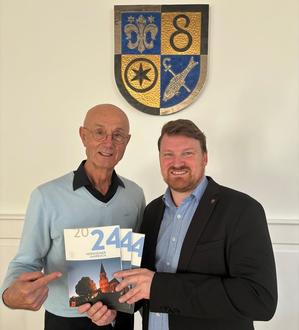 Ortsbürgermeister Sven Koch erhält aus den Händen des Schriftleiters Dr. Klaus Eichenlaub die ersten Exemplare der neuesten Ausgabe des Herxheimer Jahrbuches.