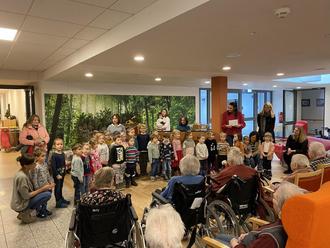Mit den selbstgebastelten Weihnachtsgrüßen im Gepäck machten wir uns am 7.12.23 auf den Weg ins Altersheim, wo wir ganz herzlich in Empfang genommen wurden. Im weihnachtlich geschmückten Foyer waren schon einige BewohnerInnen versammelt und warteten voller Vorfreude auf die kleinen Gäste. Unser Ortsbürgermeister Sven Koch, der uns im Vorfeld tatkräftig unterstützte, hieß uns alle herzlich Willkommen und freute sich sehr über das Zusammenkommen von Jung und Alt in diesem Rahmen. Um 10 Uhr nahmen die Kinder und Erzieherinnen Rund um das Klavier Aufstellung, wo uns Frau Konter musikalisch begleitete. Die Seniorinnen und Senioren lauschten dem Potpourri an Nikolaus- und Weihnachtsliedern und stimmten bei dem ein oder anderen Lied auch selbst mit ein. Die glücklich-glänzenden Augen der alten Menschen waren solch ein Ansporn für unsere Kinder, um ein ums andere Lied hochkonzentriert und textsicher aus voller Kehle mitzusingen. Im Anschluss erhielten die kleinen Sängerinnen und Sänger viel Applaus und durften nun endlich den Anwesenden ihre Weihnachtspost überreichen. Die Stimmung war magisch, sowohl die Beschenkten als auch die Schenkenden waren sehr glücklich über den kurzweiligen Vormittag.