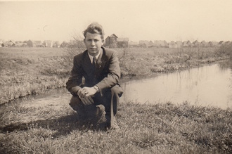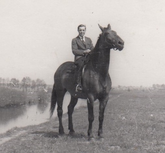 Alfons Flick bei einem Sonntagsritt entlang des noch baumfreien Ufer des Panzergrabens Anfang der 1950er.
