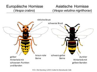 Die Asiatische Hornisse ist mit einer Körperlänge von 1,5 bis 2,4 cm etwas kleiner als die heimische Europäische Hornisse und besonders an der Färbung deutlich zu unterscheiden.