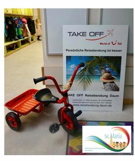Anfang November durften wir eine wunderbare Überraschung erleben: Frau Andrea Daum vom Reisebüro Take-Off in Herxheim spendete unserer Kita St. Maria 350 Euro. Von dieser großzügigen Zuwendung konnten wir zwei neue Dreiräder für unsere Kleinsten anschaffen.