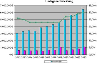 Der Haushalt 2023 wurde mit einem Umlagesatz von 30 % (im Vorjahr 28%) beschlossen. Es errechnet sich im Ergebnishaushalt ein Jahresüberschuss von 40.175 €. Der Saldo der ordentlichen Ein-und Auszahlungen reicht aus, um die Tilgung der Kredite in Höhe von 490.370 € zu finanzieren. Es errechnet sich eine freie Finanzspitze von 452.755 €. Der Haushalt 2023 ist somit ausgeglichen.