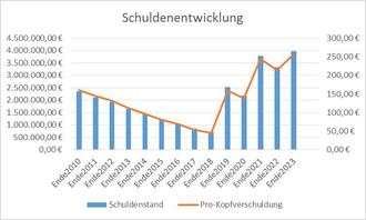 Ende 2022 beträgt der Schuldenstand der Verbandsgemeinde 3.398.294 €. Nach Neuaufnahme eines Darlehens für Schulbaumaßnahmen in Höhe von 1.139.000 € aus der Kreditermächtigung des Jahres 2022 und den planmäßigen Tilgungsleistungen wird der Schuldenstand Ende 2023 bei 3.976.928 € liegen. Dies entspricht einer durchschnittlichen Pro-Kopf-Verschuldung von 255,49 €.