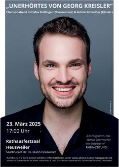 Die Aktion Kultur Heusweiler und der Richard-Wagner-Verband Saarland e. V. präsentieren am Sonntag, 23.03.2025 um 17.00 Uhr im Rathausfestsaal der Gemeinde einen Chansonabend unter dem Motto „Unerhörtes von Georg Kreisler“. Mitwirkende sind der Chansonnier Max Dollinger und der Pianist Achim Schneider.
