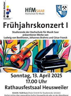 Die Aktion Kultur Heusweiler und die Gemeinde Heusweiler präsentieren am Sonntag, 13.04.2025 um 17.00 Uhr im Rathausfestsaal ein klassisch/romantisches Konzert in Kooperation mit der Hochschule für Musik Saar. Diese Veranstaltung bildet den Auftakt der insgesamt 4 Termine umfassenden Reihe „Frühjahrskonzerte 2025“ der Aktion Kultur Heusweiler.