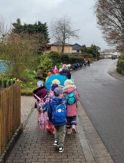Wieder einmal machten sich die Vorschulkinder aus der Kita Kutzhof auf den Weg zur Schulturnhalle in Wiesbach. Dies war eine Spielstätte der 32. Eppelborner Figurentheater Tage. Der Wandertag wurde von Regenschauern begleitet, aber alle 33 Kinder und ihre Betreuer*innen freuten sich schon sehr auf das Theaterstück. Das Wolfhager Figurentheater aus Breuna führte das Stück: „Der Grüffelo“ auf. Und die Kita übernahm den Eintritt. Die Kinder lieben das Bilderbuch, in dem es nicht ungefährlich für eine kleine Maus ist, allein durch den Wald zu spazieren. Doch wenn man so viel Fantasie hat, wie diese Maus, kann einem nichts passieren. Sie erfindet einfach einen riesigen Freund namens Grüffelo und schon nehmen ihre Feinde Reißaus…Die Kinder verfolgten voll Spannung die packende Geschichte und spendeten begeistert Applaus. Dann traten alle wieder zu Fuß den Rückweg an. Wir freuen uns schon auf das nächste Mal, wenn wir wieder zu den Theatertagen wandern.