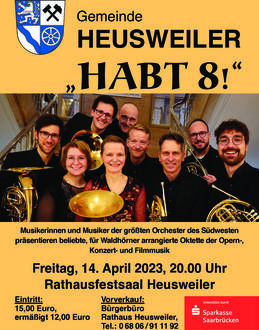 Habt 8! - Musikerinnen und Musiker der größten Orchester des Südwesten präsentieren beliebte für Waldhörner arrangierte Oktette der Opern-, Konzert- sowie auch Filmmusikliteratur. Das Projekt, sich gemeinsam über die Grenzen des eigenen Orchesters hinweg zu treffen, frei von festgelegten Probezeiten und Programmen zu musizieren, hat 2020 in der durch die Pandemie begründeten Isolation vieler Menschen seinen Ursprung: befreundete Hornist*innen namhafter Orchester schlossen sich zusammen, um auf privaten Wiesen oder Parkplätzen verschiedener Seniorenresidenzen zu spielen und in dieser Zeit den Mitmenschen Freude zu bringen - in diesem Sinne, passt auf euch auf und Habt 8!