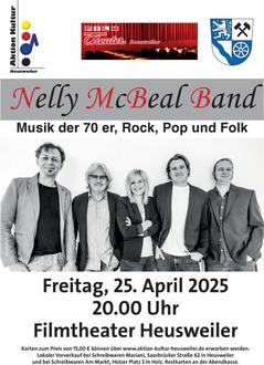 Die Aktion Kultur Heusweiler präsentiert in Kooperation mit der Gemeinde Heusweiler am Freitag, 25.04.25 um 20.00 Uhr im ehemaligen Filmtheater Heusweiler, Saarlouiser Str. 27 die Nelly McBeal Band. Die 5-köpfige Akustikformation spielt Musik der 70er, Rock, Pop und Folk.