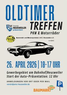 Am 26.04.2026 findet nun zum siebten Mal das Oldtimertreffen des AMC Heusweiler (Automobil- und Motorsportclub Heusweiler e.V. im ADAC) in Kooperation mit der Gemeinde Heusweiler auf den Parkplätzen von Rewe, LIDL und dem Globus Baumarkt statt. Herzlichen Willkommen sind Autos und Motorräder bis Baujahr 1996. Ab 10:00 morgens werden die ersten Fahrzeuge erwartet.