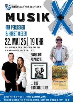 Die Gemeinde Heusweiler startet mit einem neuen Kulturformat "Musik + X" am 22. Mai 2026 im Filmtheater Heusweiler. Künftig wird Musik verschiedener Genres mit einem X kombiniert, wobei das X für Lesung, Poetry, Comedy, kulinarische Genüsse, Film, Theater oder Tanz stehen kann. Oder auch eine außergewöhnliche Örtlichkeit, in der die Musik eine besondere Wirkung entfaltet. Lassen Sie sich überraschen.