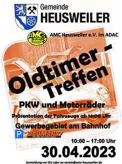 Am 30. April 2023 findet auf dem Parkplatz des Globus Baumarktes im Gewerbegebiet am Bahnhof das dritte Oldtimer Treffen der Gemeinde Heusweiler in Kooperation mit dem Automobil- und Motorsportclub (AMC) Heusweiler e.V. im ADAC statt. Es werden sowohl Autos als auch Motorräder erwartet. Die Veranstaltung beginnt um 10.00 Uhr und endet um 17.00 Uhr.