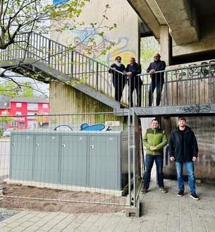 Die Mitarbeiter der Gemeinde Heusweiler, (v.l.n.r.) Markus Ringe (Fachbereichsleitung 1), Sebastian Janowski (Tiefbau), Erwin Ziegler (Tiefbau) und Heike Nowack (Fachbereichsleitung 4) sowie Bürgermeister Thomas Redelberger (2.v.r.) während der Inaugenscheinnahme der neuen Fahrradboxen.