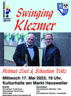 Die Aktion Kultur Heusweiler hat am Mittwoch, 17. Mai um 19 Uhr in der Kulturhalle am Markt in Heusweiler Helmut Eisel und Sebastian Voltz mit ihrem Programm „Swinging Klezmer“ zu Gast. Hochkarätiger Swing trifft auf jiddische Tanzmusik.