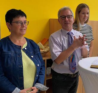 Von links: Kerstin Halladin, Geschäftsführerin der ABG, Thomas Redelberger, Bürgermeister Heusweiler und Katharina Luksic, stellvertretende Ortsvorsteherin Holz, bei der Eröffnung der Nachmittagsbetreuung.