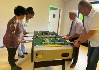 Von links: Das Betreuer-Team, Thomas Redelberger, Bürgermeister Heusweiler und Richard Wachall, Ortsvorsteher Eiweiler testen den Tischkicker im Toberaum.