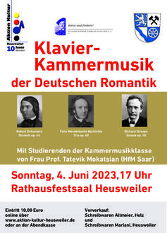 Beim nächsten Konzert der Aktion Kultur Heusweiler e. V. steht die Förderung begabter junger Künstler ganz im Mittelpunkt. Drei Ensembles der Klavier-Kammermusikklasse von Frau Prof. Tatevik Mokatsian an der Hochschule für Musik Saar, die kurz vor ihrem künstlerischen Studienabschluss stehen, präsentieren sich mit herausragenden kammermusikalischen Werken der Deutschen Romantik. Mitveranstalter ist der Richard- Wagner-Verband Saar, der sich ebenfalls programmatisch der Förderung junger Künstler verschrieben hat. Weiterer Mitveranstalter ist die Gemeinde Heusweiler.