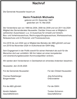 Wir werden dem Verstorbenen in Dankbarkeit ein ehrendes Andenken bewahren.