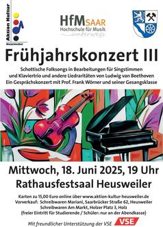 Das Konzert ist als Gesprächskonzert konzipiert, wird von Prof. Frank Wörner moderiert und von seiner Gesangsklasse an der HfM Saar gestaltet. Es findet statt im Rahmen der Reihe „HfM unterwegs“ mit freundlicher Unterstützung der VSE statt. Mitveranstalter ist die Gemeinde Heusweiler.