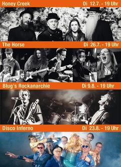 Die weiteren Konzerte sind: Dienstag, 26.7.2022 mit „The Horse“, eine phantastische Band, die von Manfred Mann bis Billy Idol abrockt.