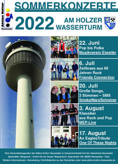 Weniger rockig, dafür umso gefühlvoller geht es beim dritten Konzert der Reihe zu: die Aktion Kultur Heusweiler und die Gemeinde präsentieren dann die Formation SMS: Joe Smoke, Michael Marx und Herbert Schreiner: Große Songs, 3 Stimmen. Das Konzert findet am Mittwoch, 20.07.22 um 19.00 Uhr am Holzer Wasserturm statt.