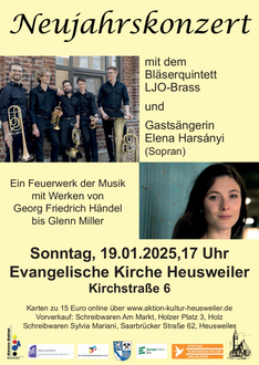 Die Aktion Kultur Heusweiler und die Evangelische Kirchengemeinde Heusweiler veranstalten am Sonntag, den 19. Januar 2025, 17.00 Uhr in der evangelischen Kirche Heusweiler (Kirchstraße 6) ein Neujahrskonzert mit dem Blechbläserquintett LJO-Brass, das bereits in der Vergangenheit zu Gast in Heusweiler war. Als Solistin des Abends wird die vielfach ausgezeichnete Sopranistin Elena Harsányi von den fünf Blechbläsern begleitet. Festliche Klänge zum Start ins neue Jahr.