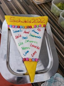 Am nächsten Morgen, waren die einen Kinder schon früh wach andere kuschelten noch etwas länger in ihrem Bett. Als alle angezogen waren ging es zum Frühstück. Im Bistro erwartete die Kinder ein Frühstücksbuffet und unsere Hauswirtschaftskraft hatte als Überraschung einen Kuchen in Form einer Schultüte gebacken. Danke dafür. Nach dem ausgiebigen Frühstück mussten wir uns auch schon etwas beeilen, denn das Bettenlager musste noch abgebaut werden und die Kinder bekamen ihre Abschiedsgeschenke vom Kindergarten überreicht, bevor die Eltern kamen. Pünktlich zum Sektempfang für die Eltern waren alle fertig. Alle versammelten sich in der Turnhalle, da es draußen schon sehr heiß war.