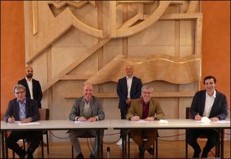 „Bürgermeister T. Redelberger (2. v.r.) und T. Schramm (rechts) bei der Unterzeichnung des Eckpunktepapiers für das Projekt Nahwärmeversorgung (Foto)“