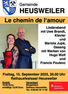 „Le chemin de l’amour“ – Dieser Liederabend vereint zwei Komponisten, die sich darin ähneln, einen unverkennbaren eigenen Stil entwickelt zu haben, beide mit einem speziellen Humor versehen und der intensiven Liebe zur Dichtung, die sie so dicht in ihre Liedkompositionen verwoben, dass Wort und Musik nicht mehr zu trennen sind.