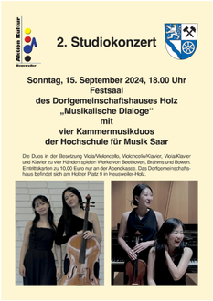 Die Aktion Kultur Heusweiler lädt ein zu ihrem 2. Studiokonzert am Sonntag, 15. September 2024 um 18.00 Uhr im Festsaal des Dorfgemeinschaftshauses Holz.