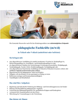 Die Gemeinde Heusweiler sucht für ihre Kindertagesstätten zum nächstmöglichen Zeitpunkt