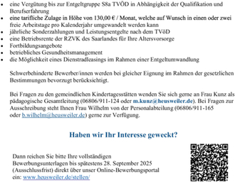 Dann reichen Sie bitte Ihre vollständigen Bewerbungsunterlagen bis spätestens 28. September 2025 (Ausschlussfrist) direkt über unser Online-Bewerbungsportal ein: www.heusweiler.de/stellen/