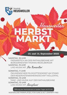Die Gemeinde Heusweiler lädt herzlich zum 30. Herbstmarkt ein, der am Wochenende vom 13. und 14. September 2025, jeweils ab 10:00 Uhr stattfindet. Das zweitägige Event, das immer am zweiten Septemberwochenende stattfindet, zieht jährlich rund 20.000 Besucher aus Nah und Fern an und ist ein bedeutender Publikumsmagnet über die Gemeindegrenzen hinaus.